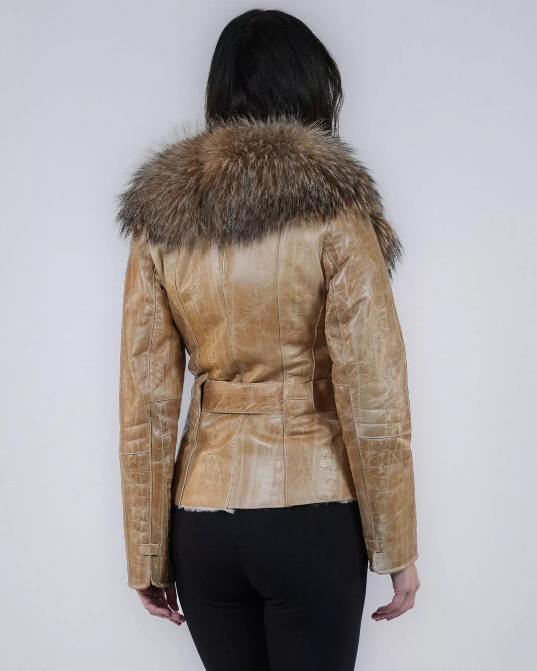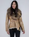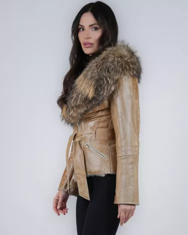 Elegancki, taliowany kożuch damski wykonany z wysokiej jakości, tłoczonej skóry jagnięcej w modnym beżowym kolorze. Model podkreśla sylwetkę dzięki dopasowanemu fasonowi oraz oddzielnemu paskowi ze skóry licowej, który umożliwia regulację w talii. Wyrazisty kołnierz obszyty naturalnym futrem z jenota dodaje całości luksusowego charakteru i zapewnia dodatkowe ciepło w chłodniejsze dni.