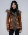 Stylowy, taliowany kożuch damski w kolorze camel to idealne połączenie elegancji i funkcjonalności na chłodniejsze dni. Wykonany w 100% z wysokiej jakości tłoczonej skóry jagnięcej, gwarantuje trwałość, komfort noszenia oraz luksusowy wygląd. Kaptur oraz przód kożucha zostały obszyte naturalnym futrem z jenota, które nie tylko pięknie się prezentuje, ale także zapewnia dodatkowe ciepło.