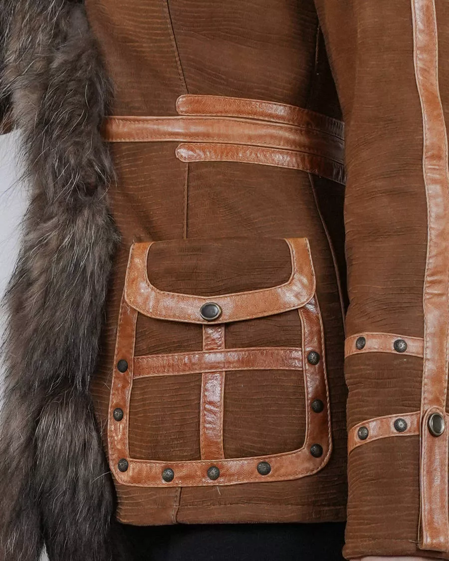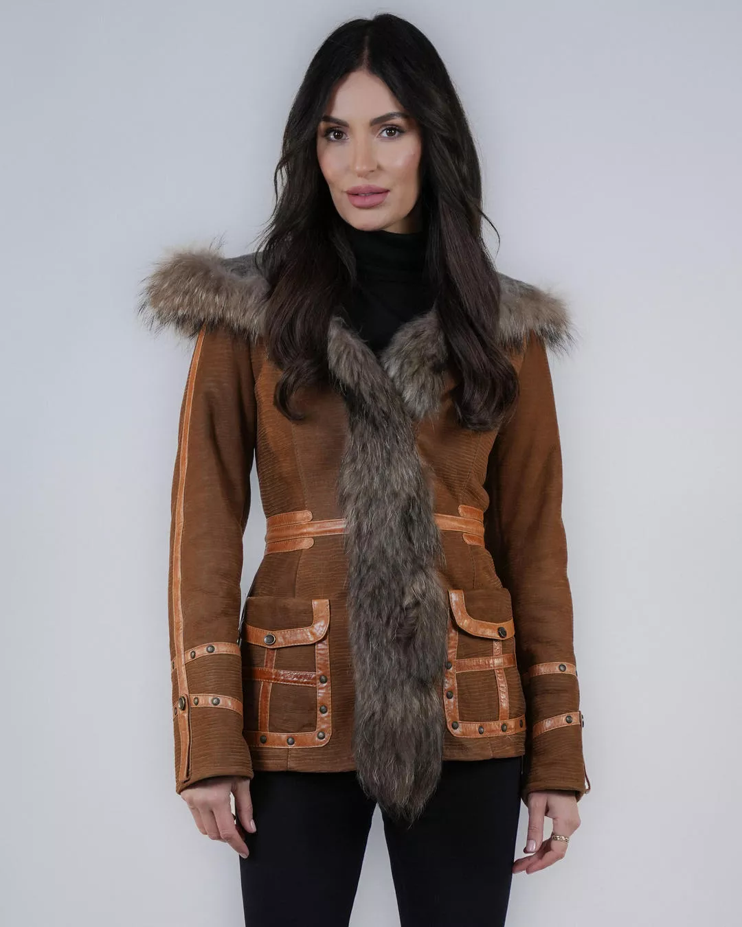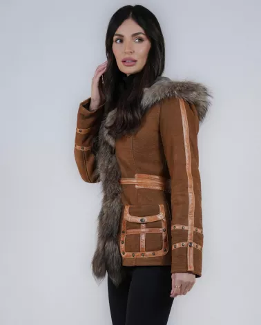 - materiał główny: 100% skóra merino; kaptur: 100% futro z jenota; przód: 100% futro z jenota