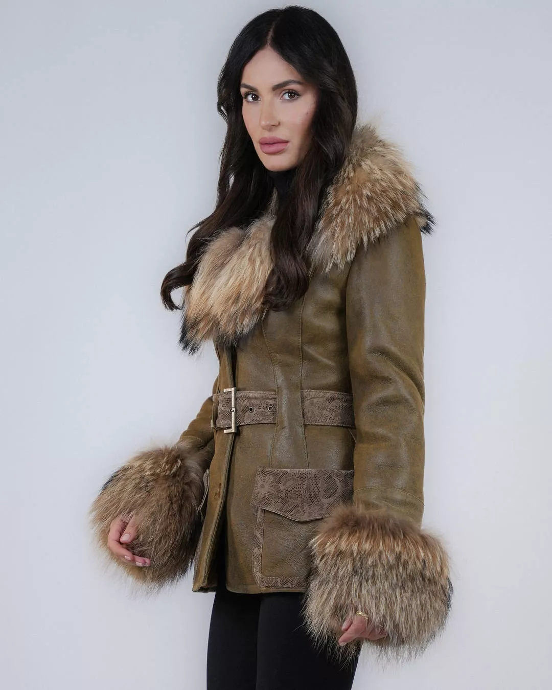 Kożuch damski oliwkowy z naturalnym futrem z jenota – taliowany