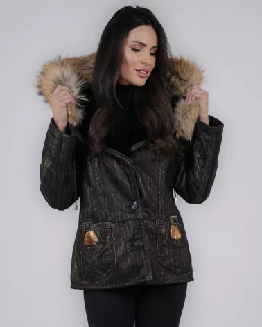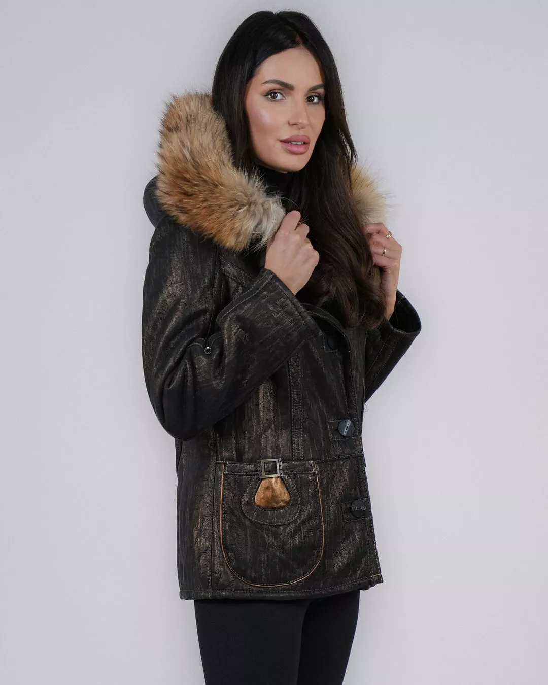 - materiał główny: 100% skóra merino; kaptur: 100% futro z jenota