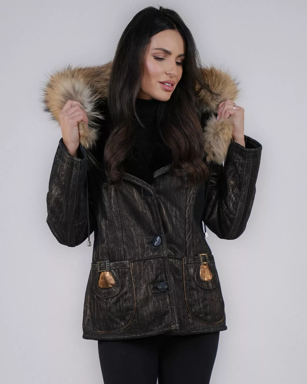Elegancki i ponadczasowy kożuch damski w kolorze czarnym, wykonany z najwyższej jakości 100% skóry jagnięcej. Model o prostym fasonie pięknie układa się na sylwetce, zapewniając komfort noszenia oraz stylowy wygląd na chłodniejsze dni. Kaptur obszyty naturalnym futrem z jenota dodaje luksusowego charakteru i doskonale chroni przed zimnem. Dodatkowym akcentem są ozdobne troczki przy kapturze, które podkreślają wyjątkowy design kożucha.