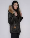 Czarny kożuch damski z kapturem obszytym naturalnym futrem z jenota