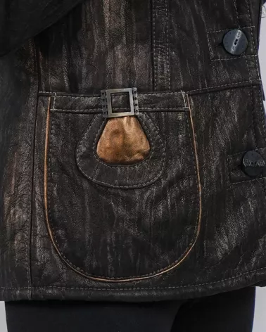 Kożuch zapinany jest na eleganckie guziki, a w talii posiada wiązany pasek, pozwalający na subtelne podkreślenie sylwetki. Model wyposażony jest w dwie praktyczne kieszenie z ozdobnymi, złotymi akcentami oraz dekoracyjną klamrą, które nadają całości wyjątkowego charakteru. Długość 70 cm sprawia, że kożuch świetnie sprawdzi się zarówno w codziennych, jak i bardziej eleganckich stylizacjach.
