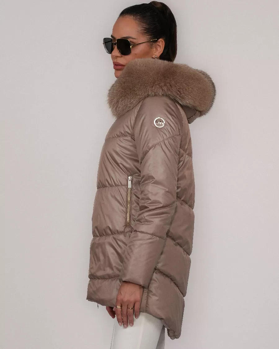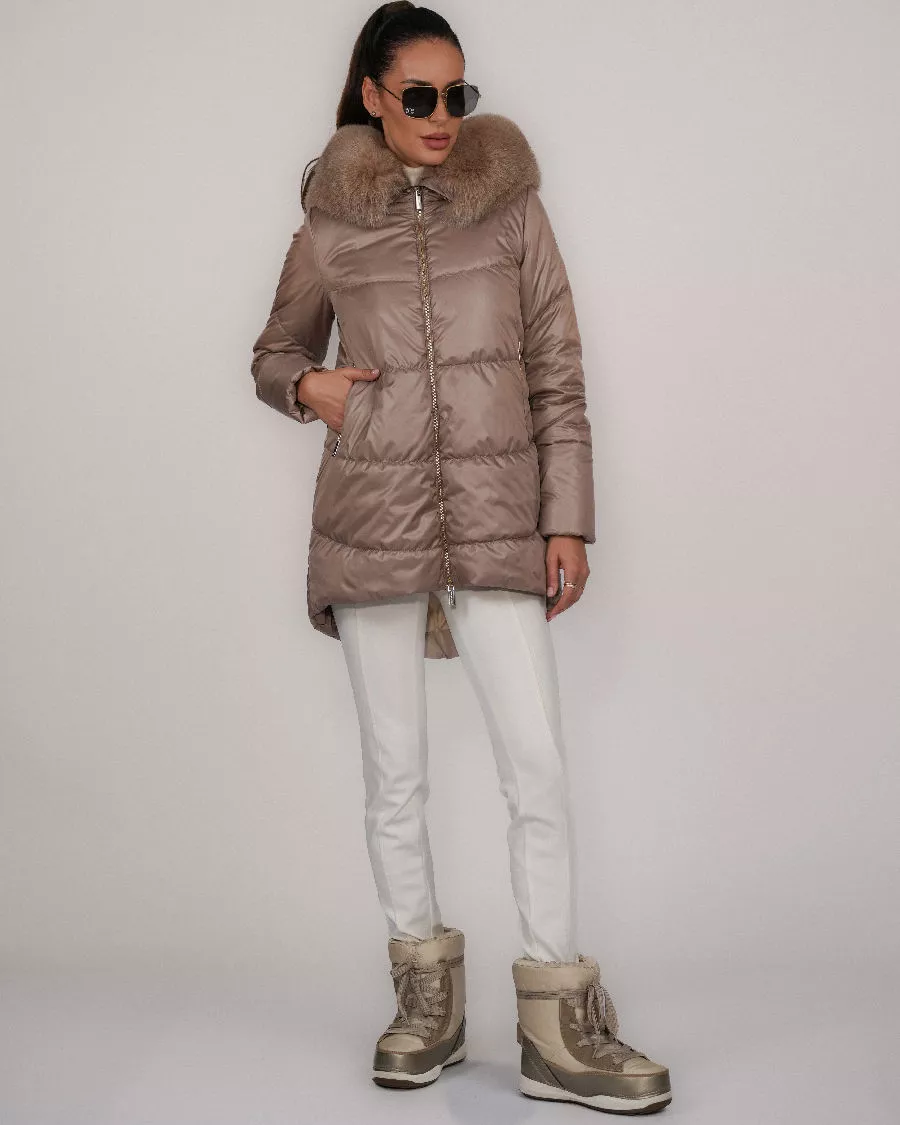 Kaptur został luksusowo obszyty naturalnym futrem lisa — miękkim, gęstym i niezwykle efektownym. Co ważne, futrzane obszycie można w każdej chwili odpiąć, dzięki czemu kurtka zyskuje dwa różne charaktery: elegancki lub bardziej sportowy.