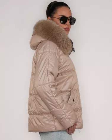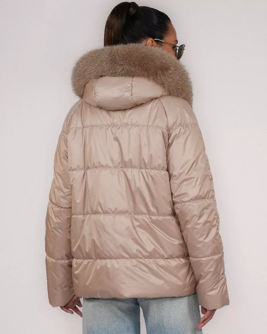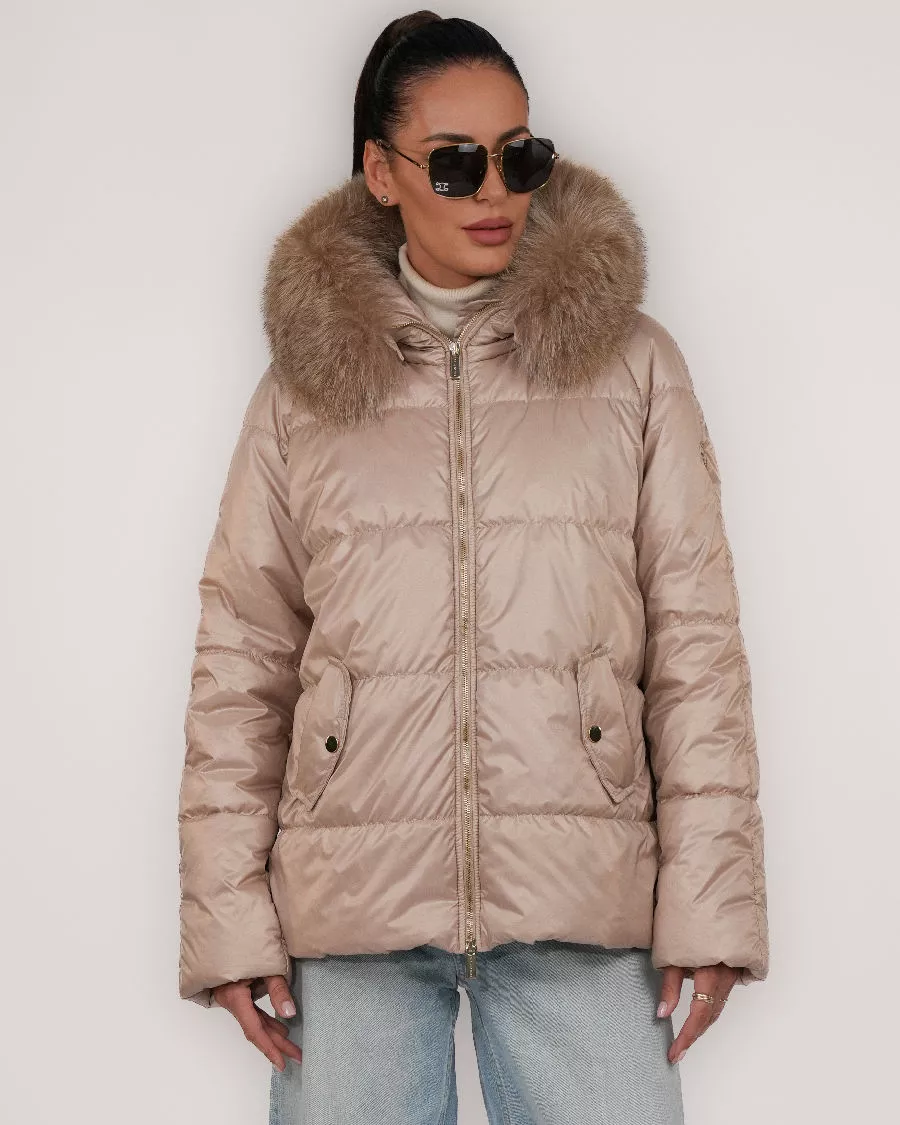 Kurtka puchowa z naturalnym futrem lisa – kolor camel