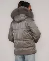 Wnętrze ocieplone zostało wysokiej jakości eko puchem o gramaturze 150 g/m², co gwarantuje doskonałą izolację termiczną nawet w niskich temperaturach. Całość prezentuje się niezwykle stylowo — nowoczesny design, szlachetny odcień taupe i puszyste naturalne futro nadają kurtce ekskluzywnego charakteru.