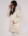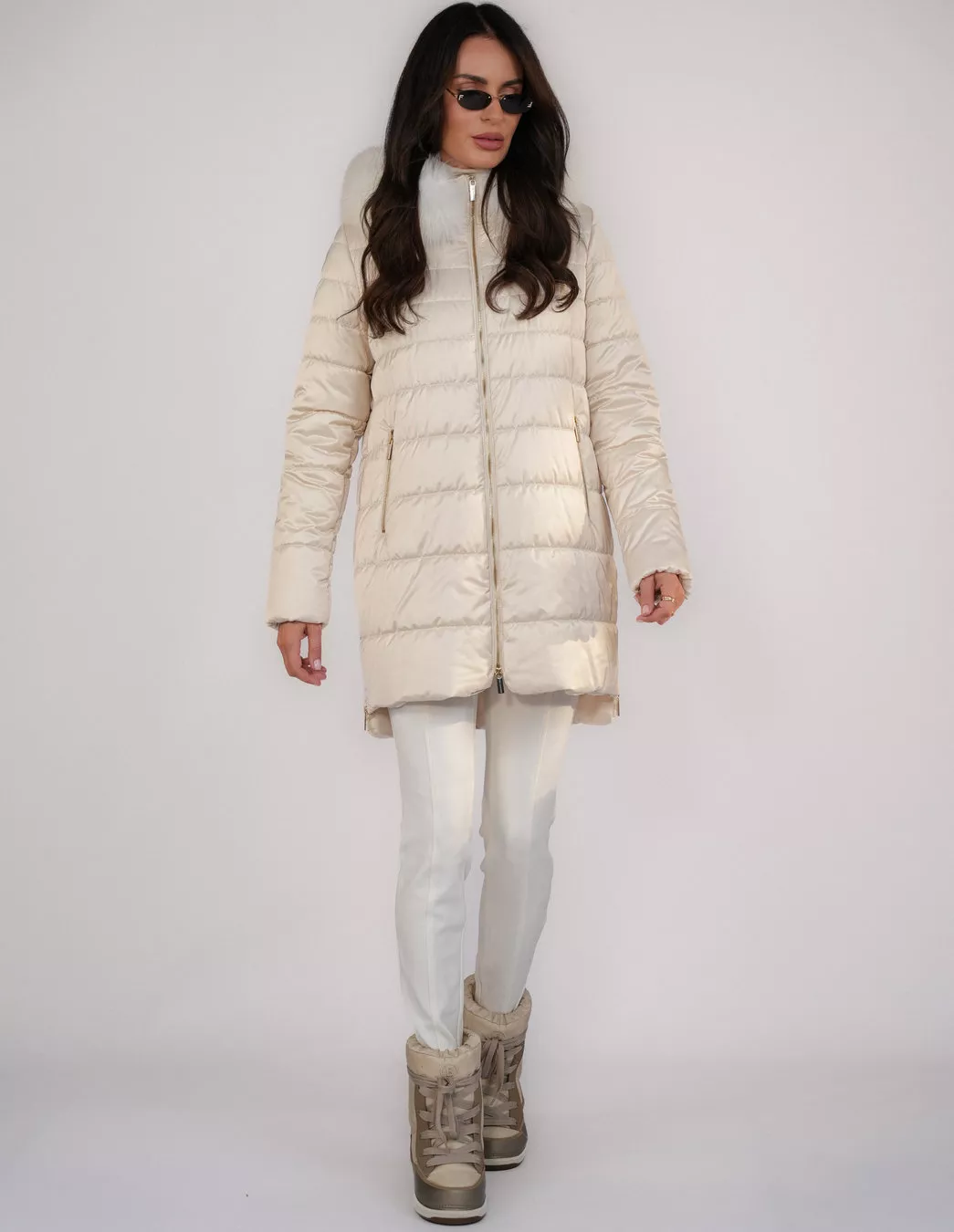 Stylowa, funkcjonalna i idealna na chłodniejsze dni – ta damska kurtka puchowa w eleganckim odcieniu waniliowym doskonale łączy modowy charakter z wysoką ochroną termiczną. Jej długość (90 cm) sprawia, że skutecznie chroni przed zimnem, a lekko połyskujący materiał dodaje całości luksusowego wyglądu.