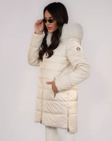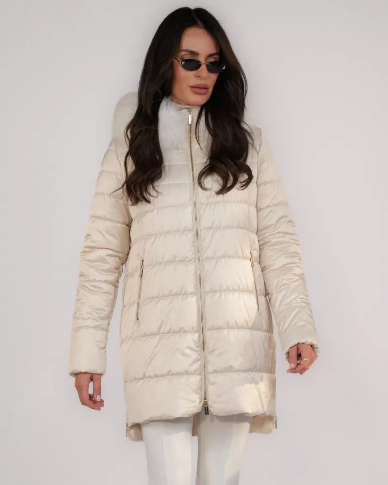Model wyposażony jest w obszerny kaptur obszyty naturalnym futrem lisa, które nadaje kurtce wyjątkowego charakteru. Obszycie jest odpinane, dzięki czemu możesz łatwo dopasować styl kurtki do okazji i pogody.
