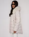 Beżowa kurtka puchowa z kapturem i futrem lisa – elegancja i komfort na zimę