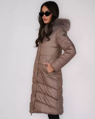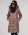 Stylowa i funkcjonalna kurtka puchowa w kolorze ciemnego beżu to idealny wybór na chłodne, zimowe dni. Jej taliowany fason pięknie podkreśla sylwetkę, jednocześnie zapewniając pełen komfort noszenia. Długość 105 cm skutecznie chroni przed zimnem, a wysoka izolacja termiczna sprawia, że kurtka sprawdzi się nawet przy niskich temperaturach.