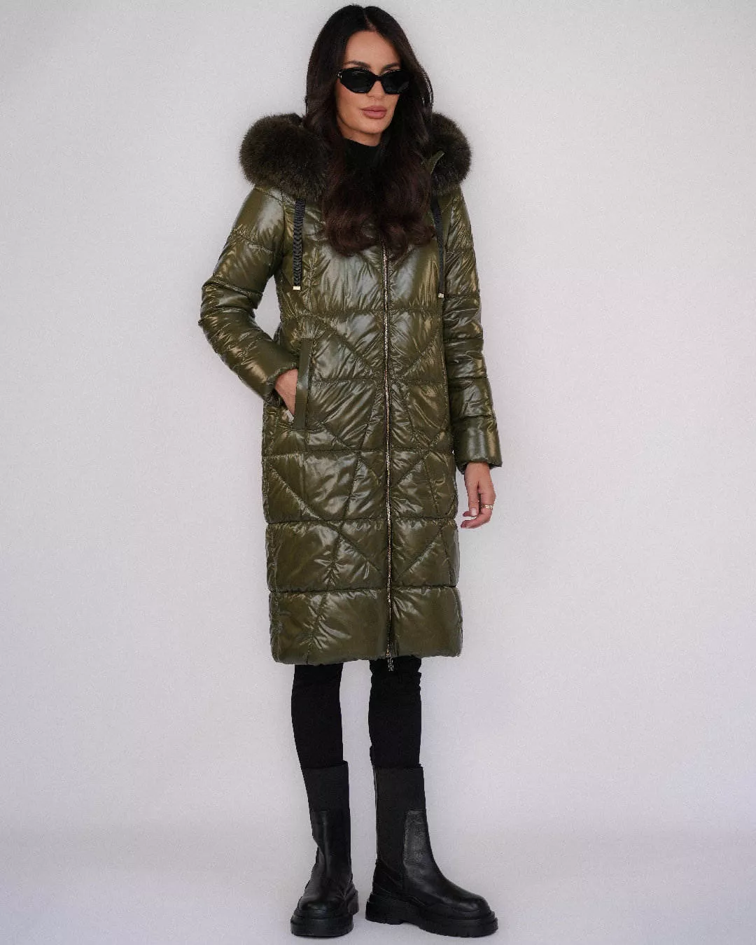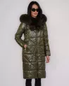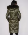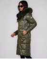 Stylowa, długa kurtka puchowa w kolorze głębokiej zieleni to idealna propozycja na sezon jesienno-zimowy. Wyróżnia się eleganckim, delikatnie połyskującym wykończeniem oraz funkcjonalnością, która gwarantuje komfort nawet w najchłodniejsze dni.
