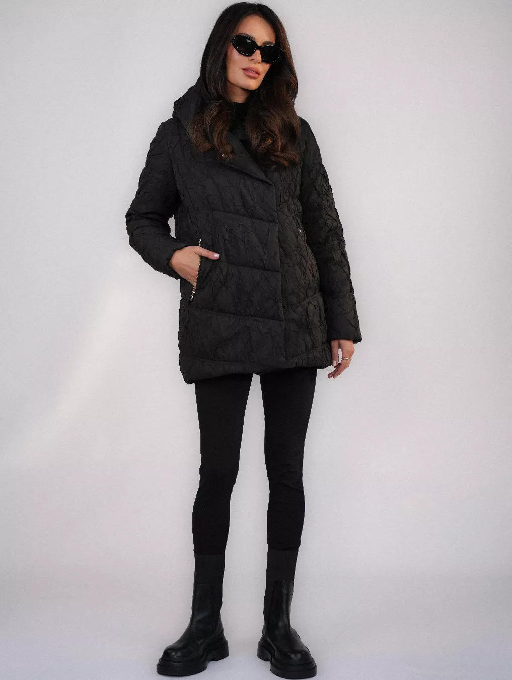 Stylowa, otulająca i niezwykle funkcjonalna — ta czarna kurtka puchowa to idealny wybór na chłodne dni. Jej unikalny, lekko „gnieciony” efekt materiału dodaje całości nowoczesnego charakteru, podkreślając miejski styl.