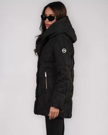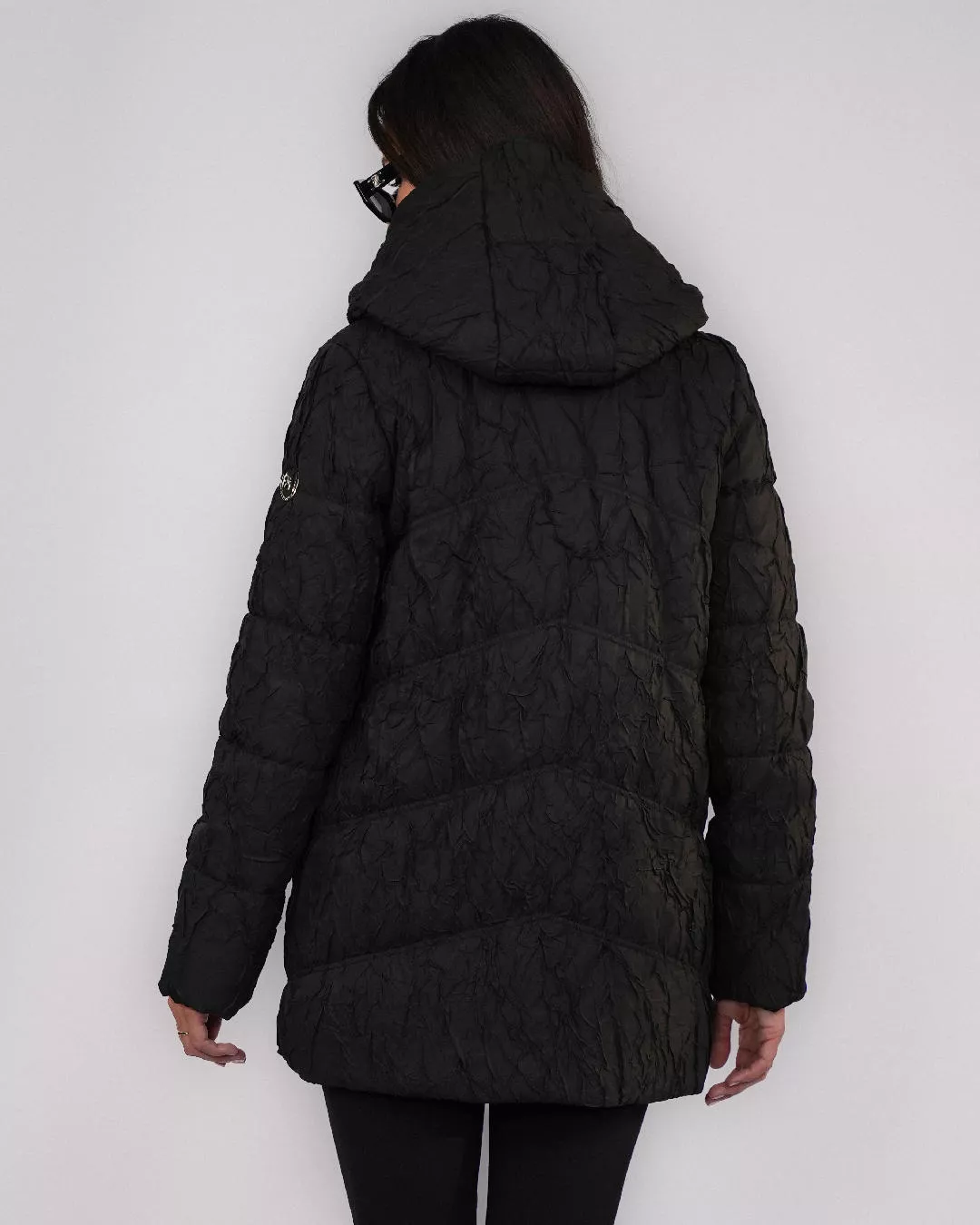 Czarna kurtka puchowa z ozdobnym marszczeniem materiału i kapturem