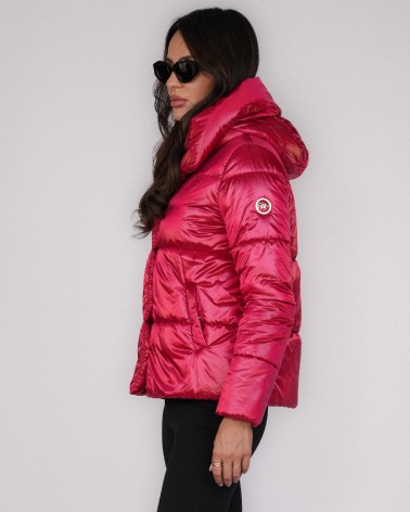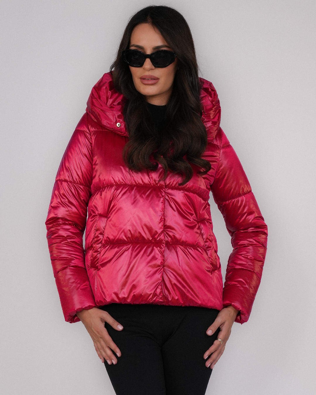Kurtka puchowa damska z kapturem – czerwony połysk, 65 cm