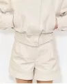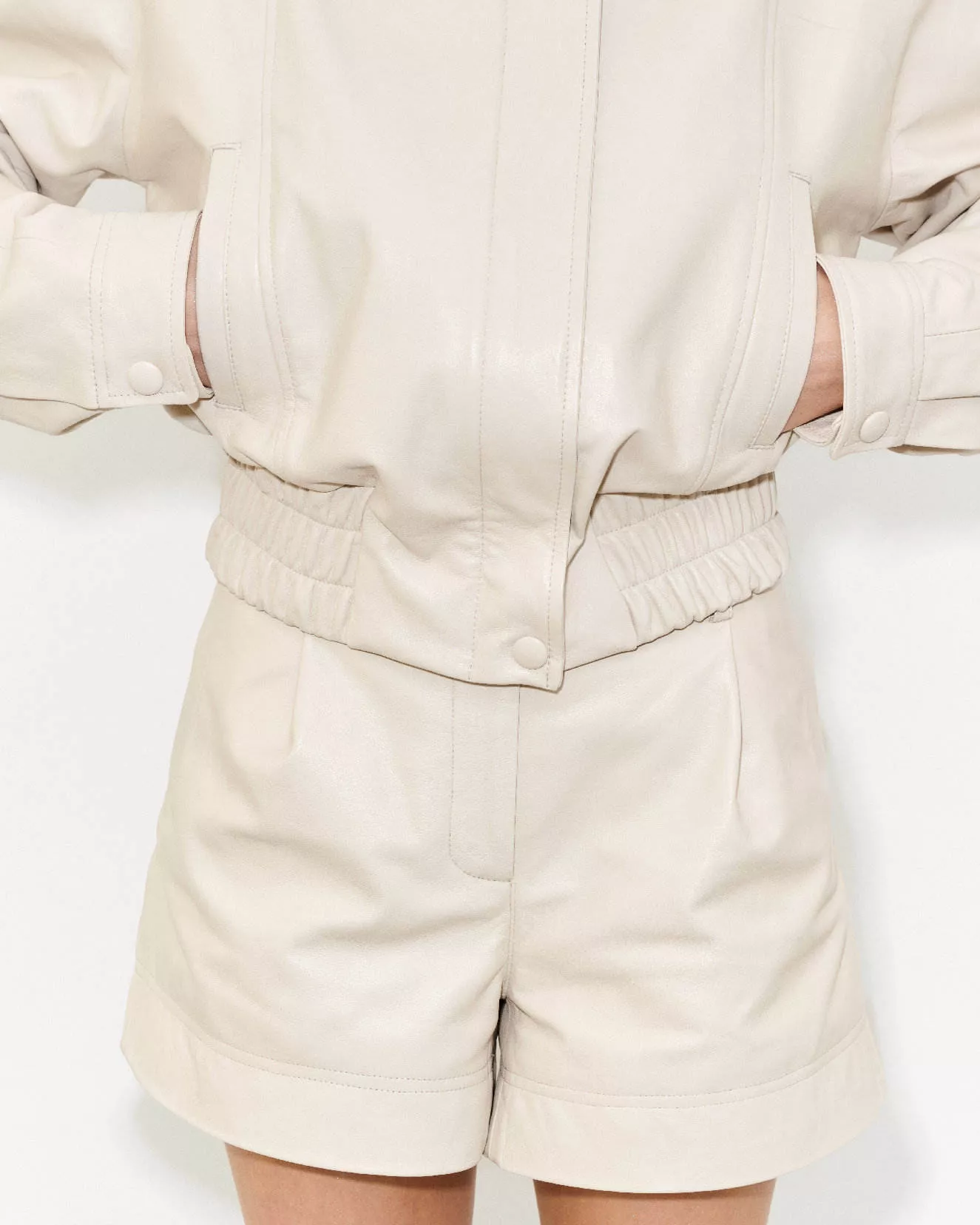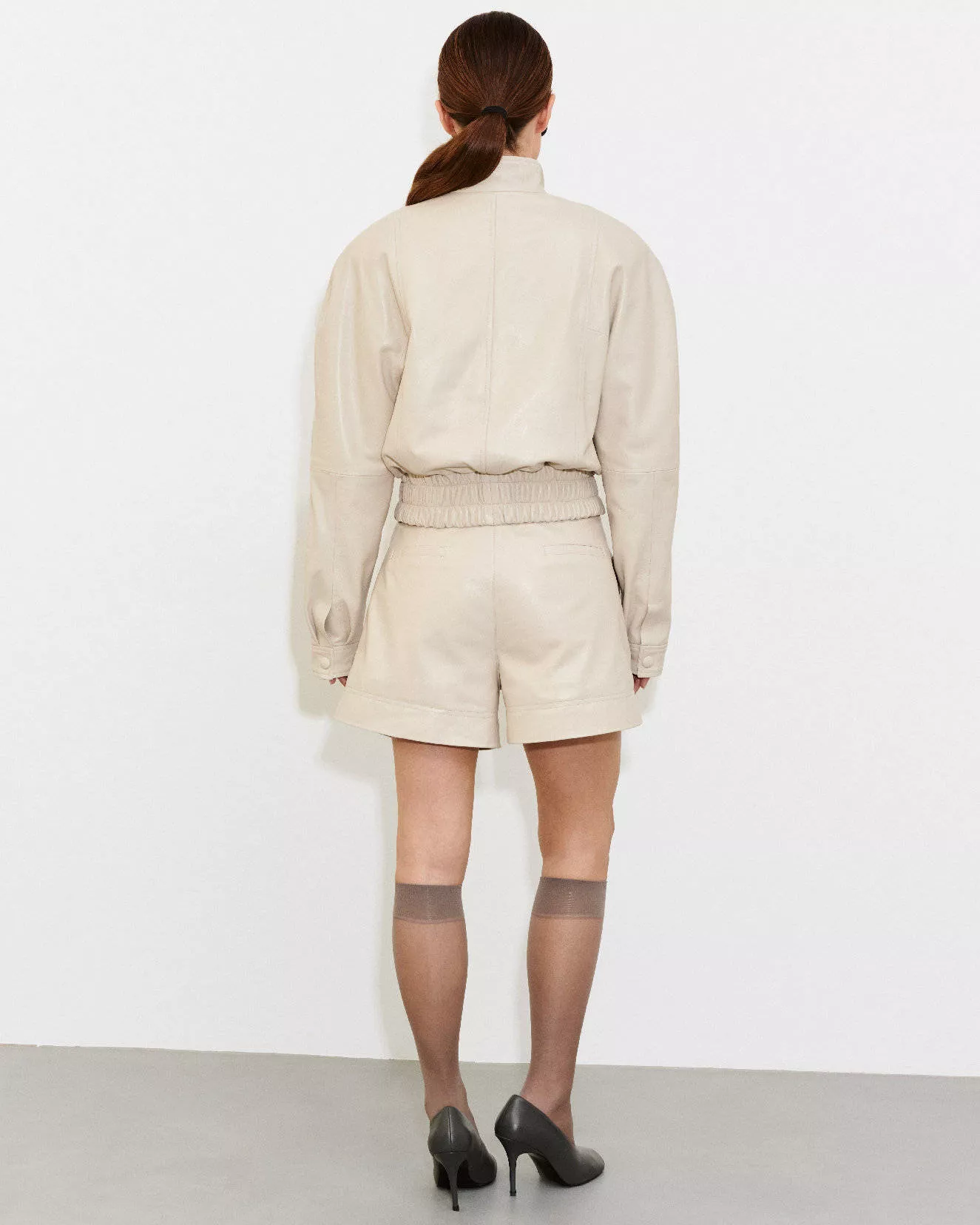 Model w kolorze ivory wyróżnia się minimalistyczną estetyką, która doskonale wpisuje się zarówno w codzienne, jak i bardziej wyrafinowane stylizacje. Poduszki na ramionach subtelnie modelują sylwetkę, nadając jej wyrazistości, a ściągacz w pasie podkreśla proporcje i zapewnia komfort noszenia.