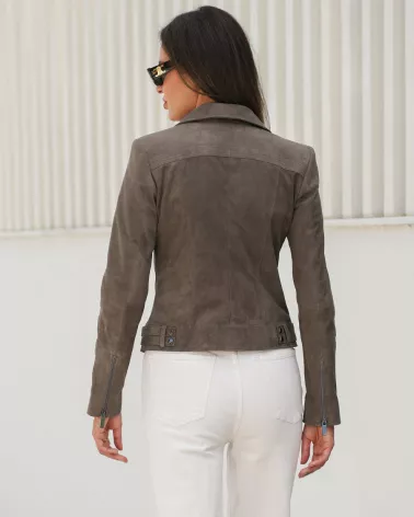 Stylowa i ponadczasowa ramoneska, która doda charakteru każdej stylizacji. Wykonana w 100% z wysokiej jakości skóry zamszowej, zachwyca miękkością i eleganckim wykończeniem. Jej taliowany fason pięknie podkreśla kobiecą sylwetkę, a długość 55 cm sprawia, że idealnie komponuje się zarówno z jeansami, jak i sukienkami.