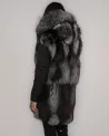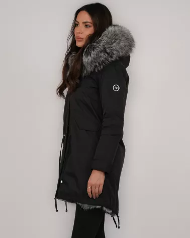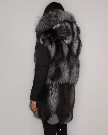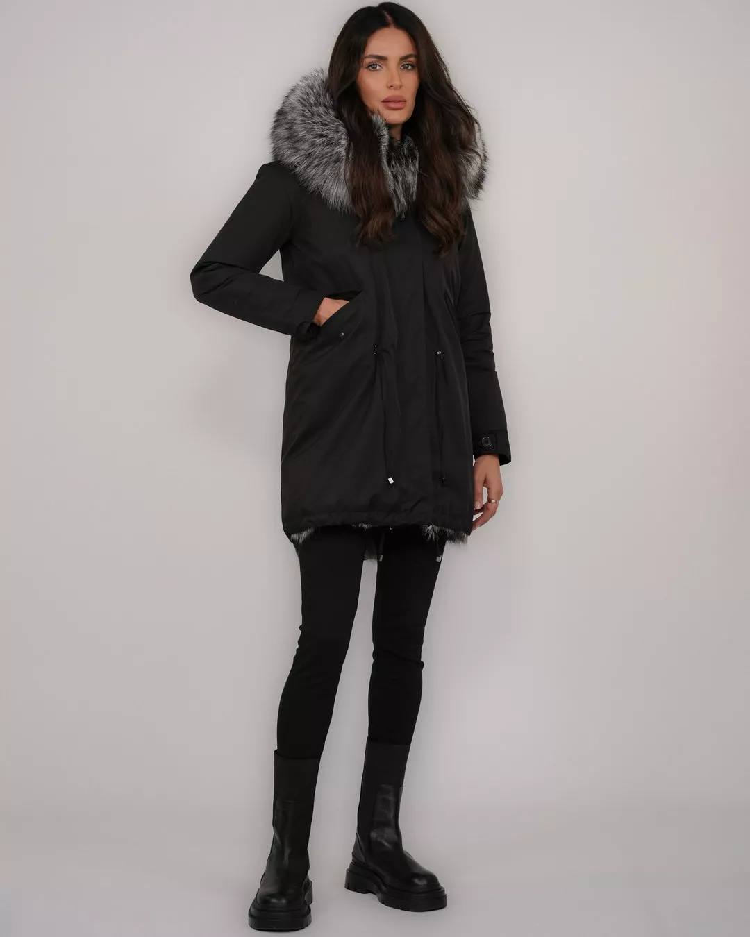 Dwustronna parka damska z naturalnym futrem lisa srebrnego – czarna