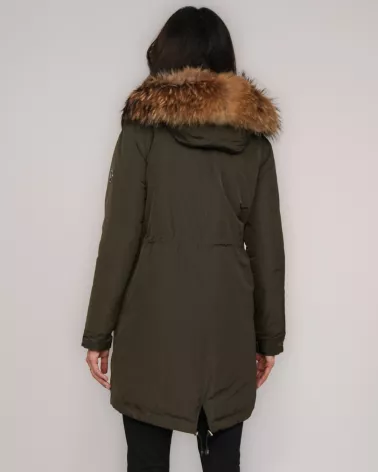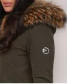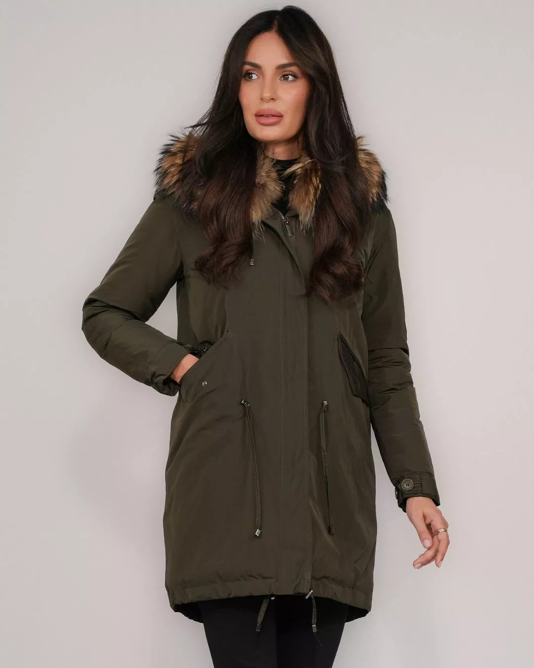 Kaptur został wykończony naturalnie wyglądającym futrem jenota, które dodaje całości luksusowego akcentu. Obszycie jest odpinane, co pozwala na łatwe dopasowanie stylu kurtki do pogody lub okazji. Zarówno kaptur, jak i dół kurtki posiadają regulowane troczki, umożliwiające indywidualne dopasowanie.