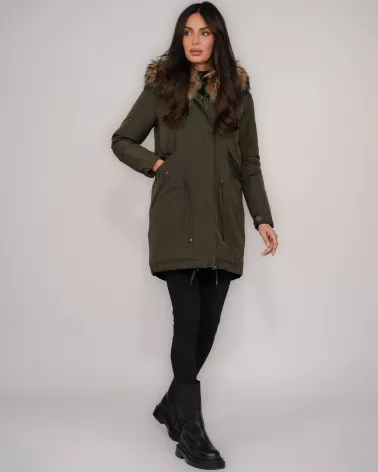 Stylowa i niezwykle funkcjonalna parka w kolorze khaki to idealny wybór na chłodniejsze dni. Fason oversize zapewnia wygodę i swobodę ruchów, jednocześnie nadając kurtce nowoczesny, lekko militarny charakter. Model ma długość 95 cm, dzięki czemu świetnie chroni przed zimnem i wiatrem.