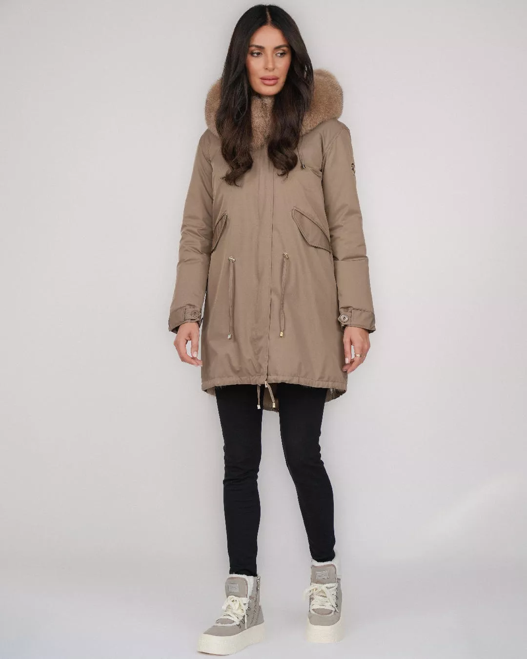 Fason oversize zapewnia swobodę ruchów oraz możliwość wygodnego noszenia grubszego swetra pod spodem. Długość 95 cm doskonale chroni przed zimnem, a praktyczny kaptur obszyty futrem z lisa dodaje całości ekskluzywnego charakteru. Obszycie kaptura jest odpinane, co pozwala dopasować kurtkę do pogody i stylizacji.