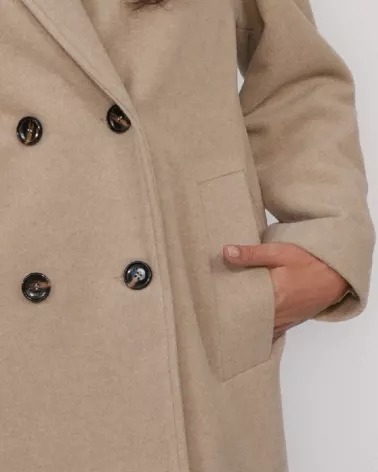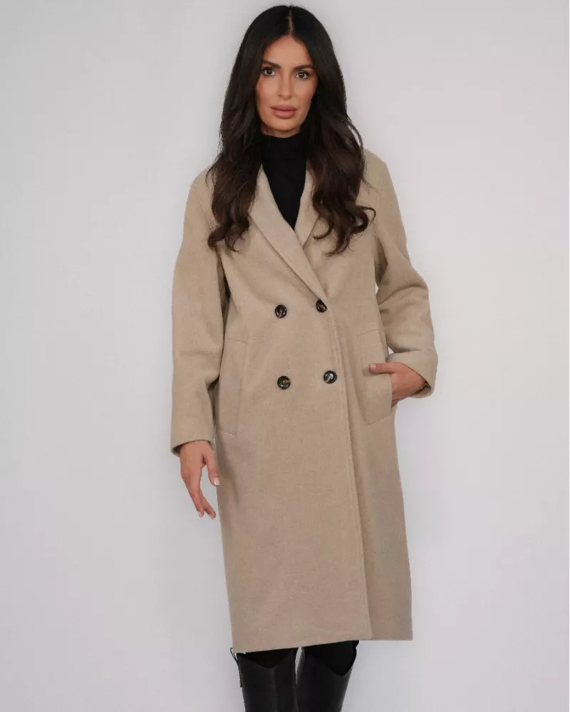 Model posiada dwurzędowe zapięcie na guziki, które podkreśla ponadczasowy charakter płaszcza oraz dwie boczne kieszenie, dodające mu funkcjonalności. Prosty krój z delikatnie dopasowaną linią sylwetki pięknie układa się na ciele, zapewniając elegancki i szykowny wygląd.