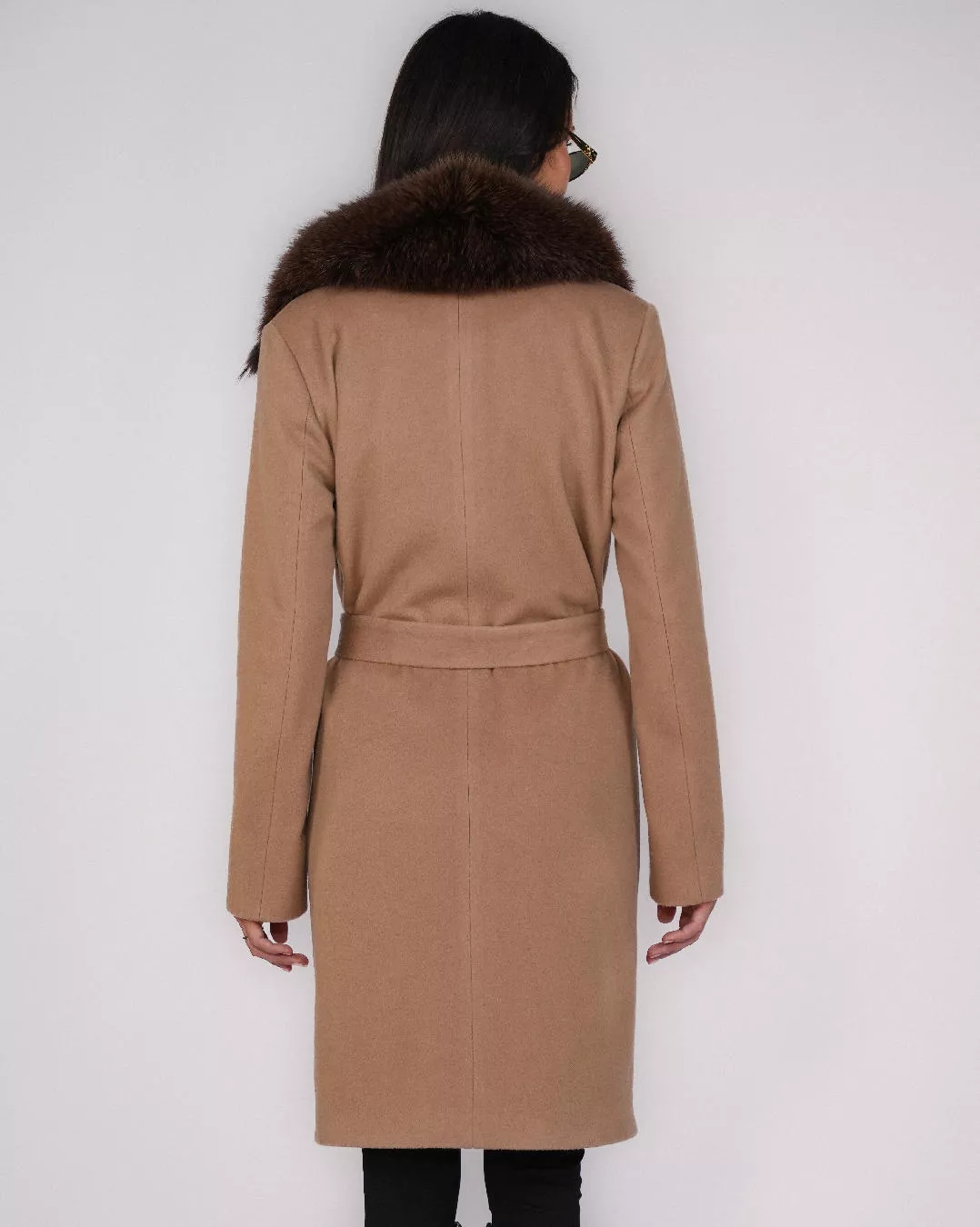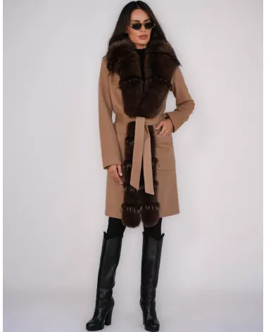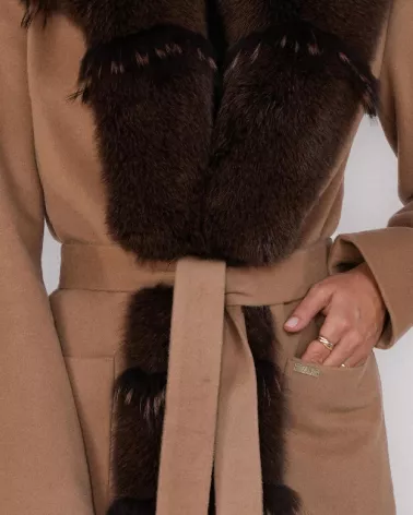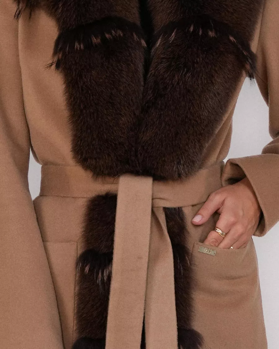 Model o długości 100 cm został wykończony efektownym obszyciem z naturalnego futra lisa, które nadaje całości wyjątkowego, ekskluzywnego charakteru. Płaszcz zapinany jest na haftki, co podkreśla jego minimalistyczną i elegancką linię.