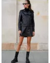 Kurtka o długości 55 cm posiada stylowe, asymetryczne zapięcie na zamek, które podkreśla jej nowoczesny charakter. Praktycznym elementem są dwie przednie kieszenie zapinane na zamek — świetne do przechowywania drobiazgów.