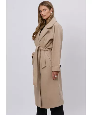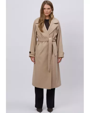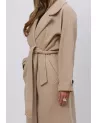 Model nie posiada tradycyjnego zapięcia – w talii przewiązywany jest oddzielnym paskiem, który pięknie podkreśla sylwetkę. Dodatkowo pasek przechodzi przez praktyczne szlufki, dzięki czemu zawsze pozostaje na swoim miejscu.