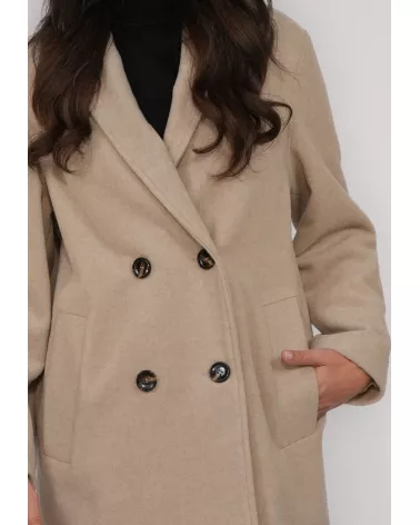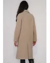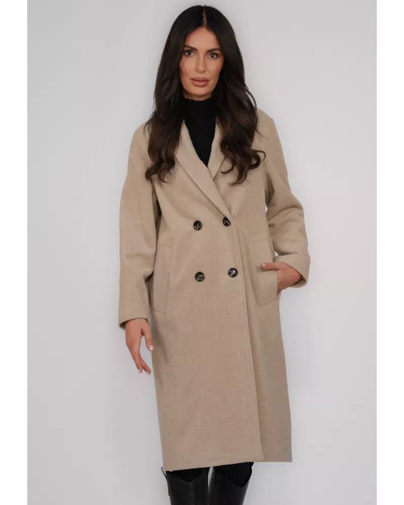 Model posiada dwurzędowe zapięcie na guziki, które podkreśla ponadczasowy charakter płaszcza oraz dwie boczne kieszenie, dodające mu funkcjonalności. Prosty krój z delikatnie dopasowaną linią sylwetki pięknie układa się na ciele, zapewniając elegancki i szykowny wygląd.