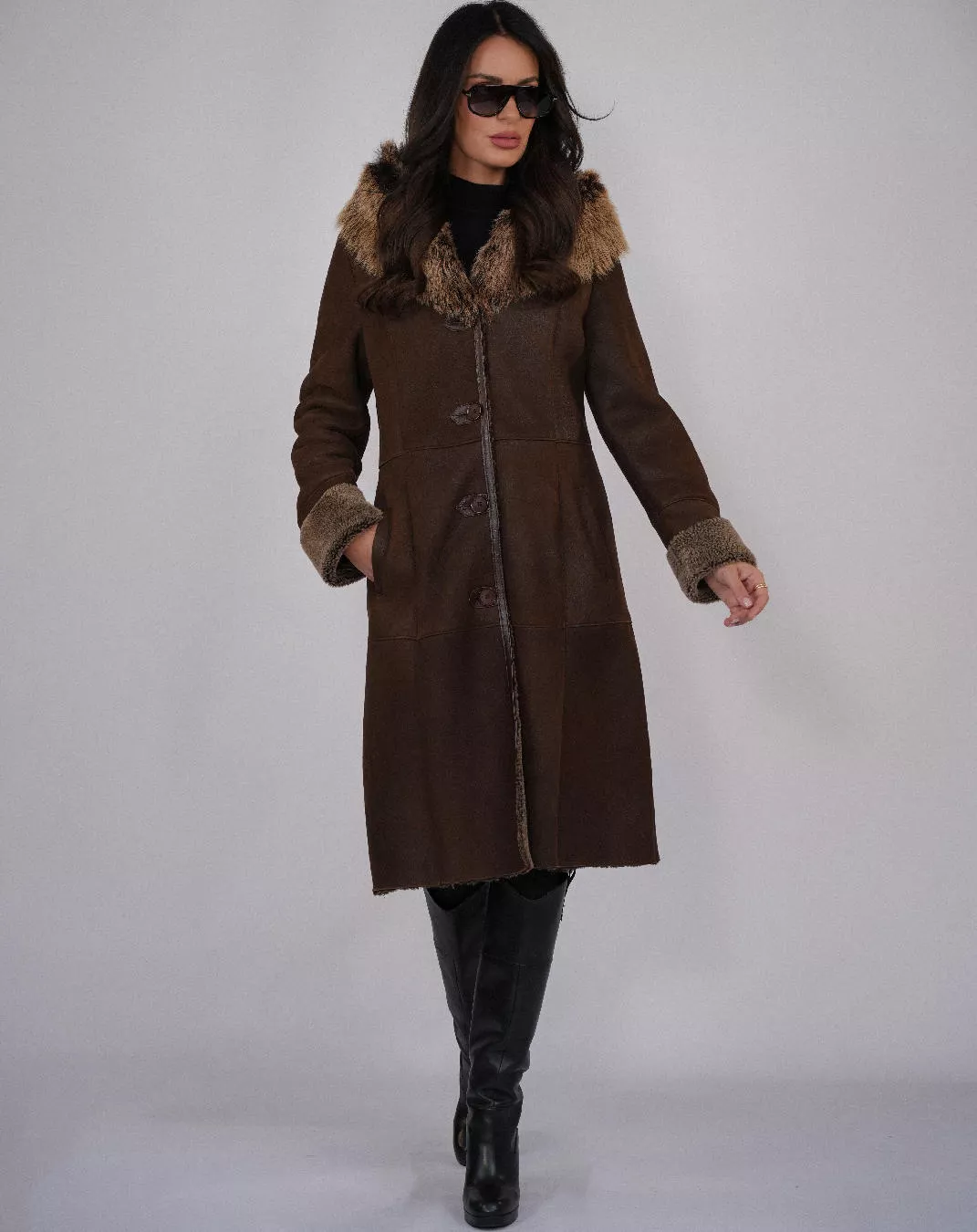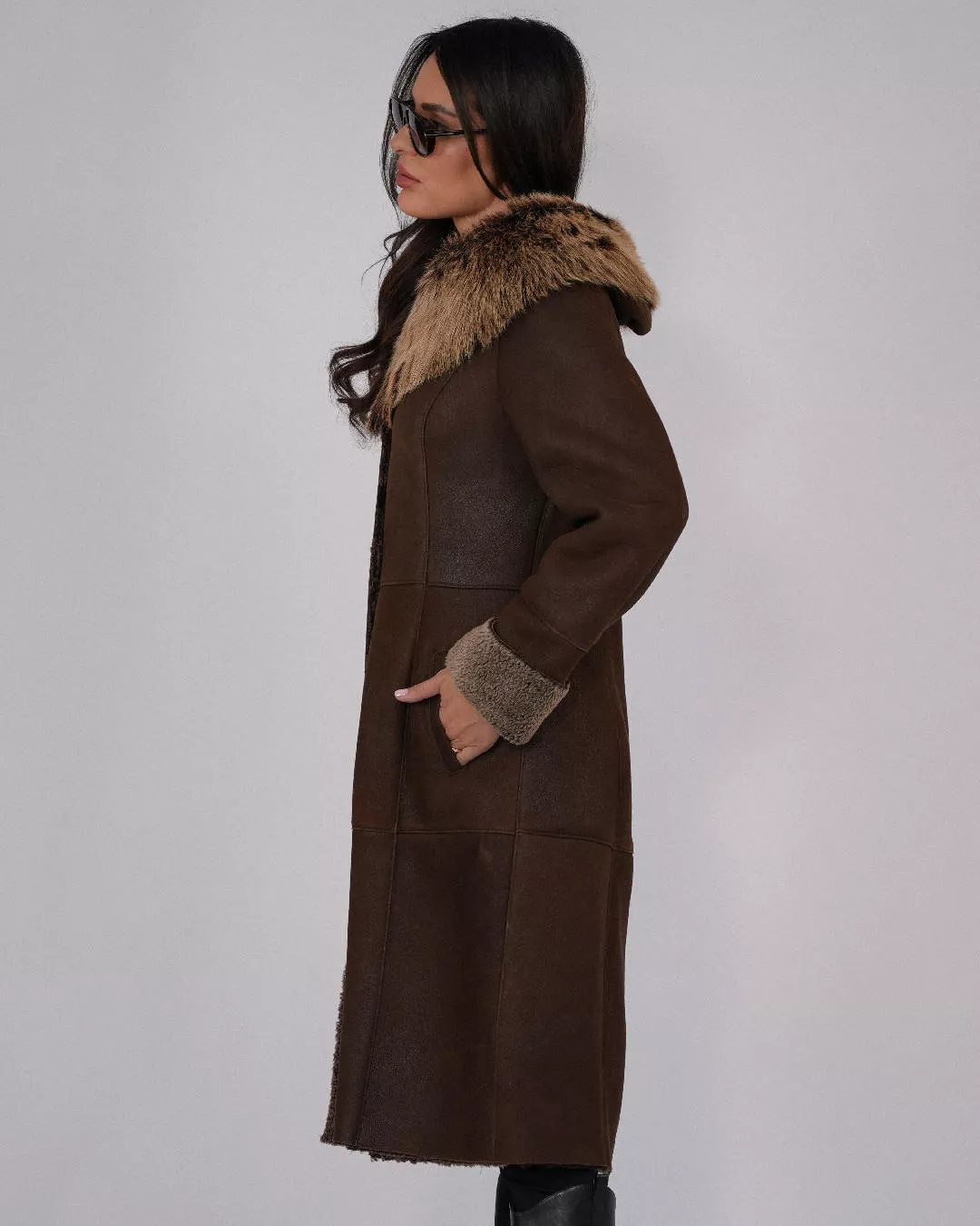 This sheepskin coat is perfect for both everyday outfits and more elegant ensembles, making it a luxurious wardrobe staple for the fall and winter seasons.
