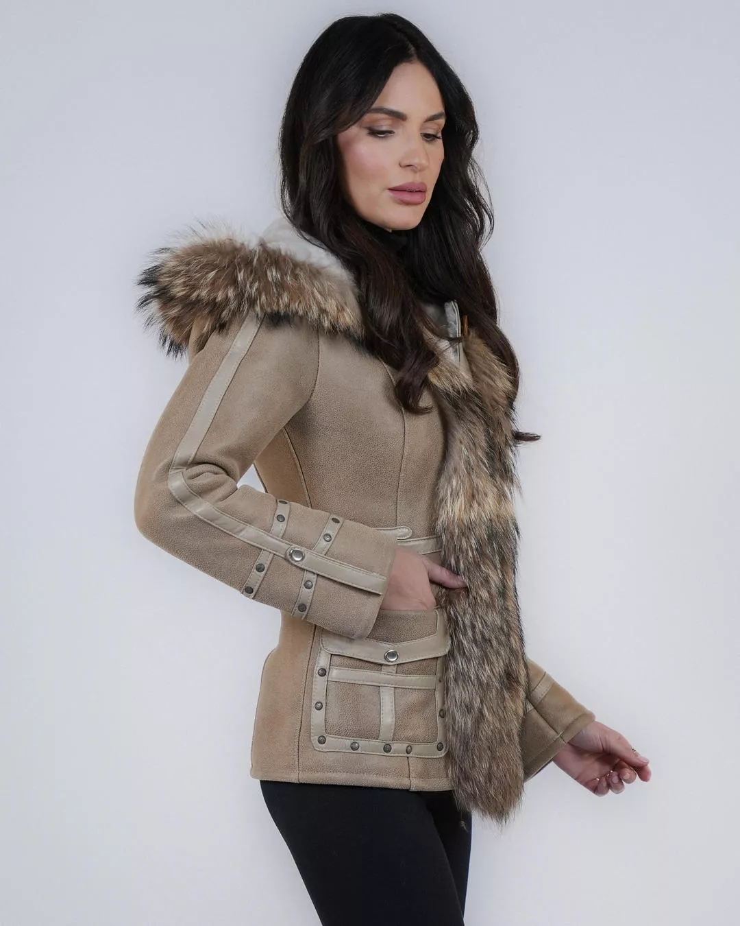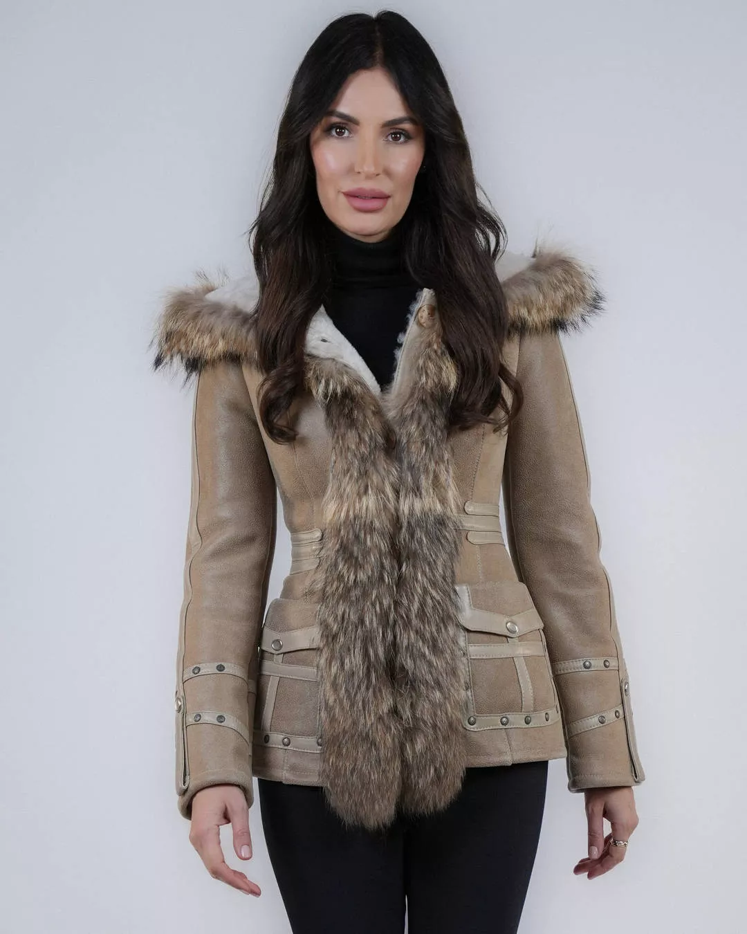 This elegant and timeless women's beige sheepskin coat is the perfect blend of classic style and luxurious finishing. The fitted cut beautifully accentuates the silhouette, while the fitted cut provides a feminine, slender look. It features a practical hood and a striking trim made of natural raccoon fur, which adds a unique character and additional protection against the cold.