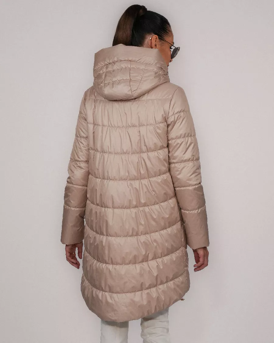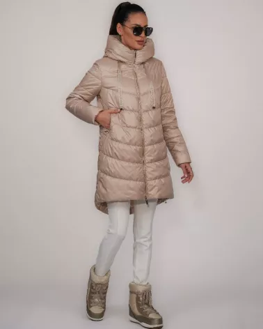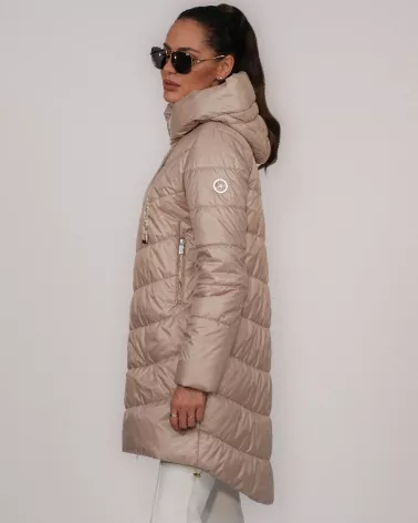 This 100 cm insulated down jacket in camel is the perfect choice for cold days. Its modern design features a slightly longer back and a generous hood that provides excellent protection against wind and cold.