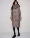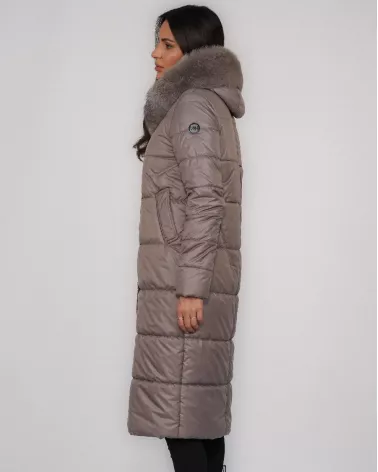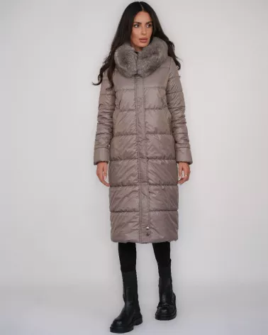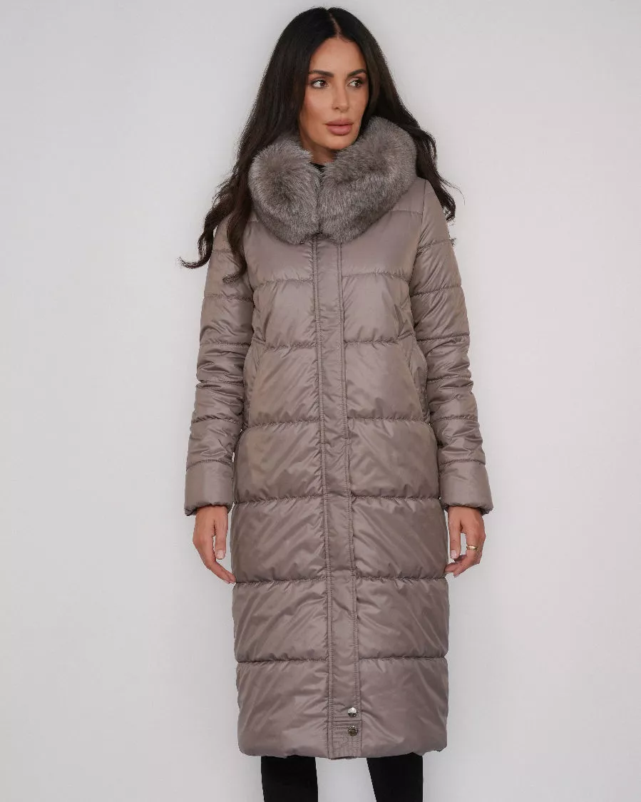 This elegant women's down jacket in taupe is the perfect choice for winter days, combining a luxurious look with the highest functionality. This 110 cm long model has a loose, comfortable cut that allows for freedom of movement and allows for comfortable wearing even over a thick sweater.
