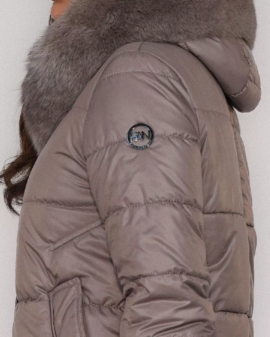 The jacket features a large hood trimmed with natural fox fur – the fur trim can be detached if necessary. It fastens with a double zipper and elegant snaps, providing additional protection against cold and wind. Two functional pockets are located on the sides.