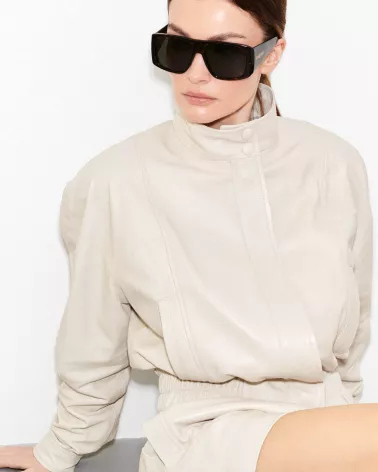 This stylish jacket, crafted from premium lambskin, combines modern design with timeless elegance. Its oversized cut lends a casual, fashionable feel, while refined details enhance the luxurious look.