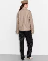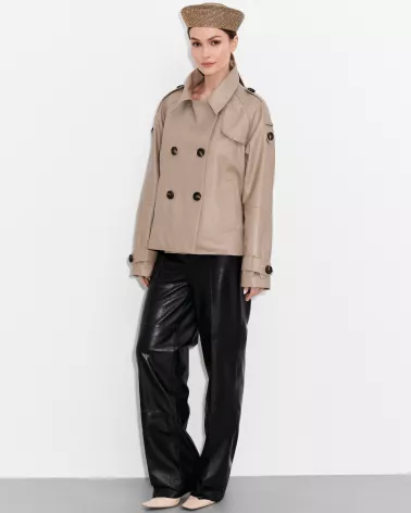 This model boasts a subtle beige color that pairs perfectly with a variety of outfits – both casual and more elegant. The double-breasted button closure emphasizes the classic silhouette while ensuring comfortable wear.