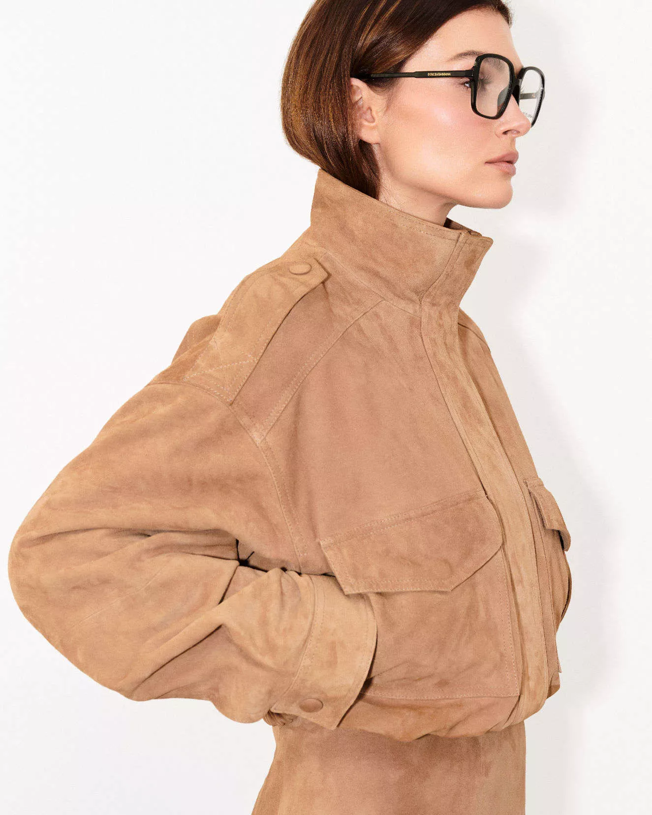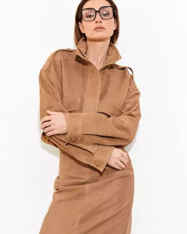 This stylish jacket, crafted from the highest quality suede in an elegant tobacco shade, is the perfect blend of classic style and contemporary design. Its short, slightly oversized cut beautifully flatters the silhouette, while refined details lend a refined character.