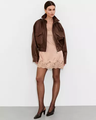 The short, 50 cm length beautifully accentuates the silhouette, while the elastic waistband ensures a perfect fit. The jacket fastens with a sturdy zipper and additional snaps for added comfort and protection from the cold.